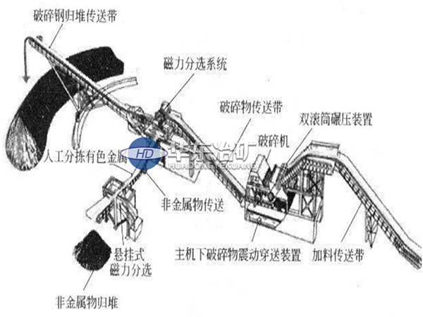 原料從輸送(sòng)機送至低(dī)轉速破碎機,雙刀盤內(nèi)向轉動,對大塊原料進行(háng),切割,撕扯,擠壓(yā)等物理破碎方式,將其破碎(suì)至尺寸統(tǒng)一的小塊狀,然後由輸送機送至,二次中速粉碎機(jī),采用多(duō)錘頭對其進行捶打,研磨,直至含鐵物料成分離狀態,通過出料篩網控製其成品尺寸,根據成品尺寸決定用那種分選設備(bèi)對其進行鐵分離。